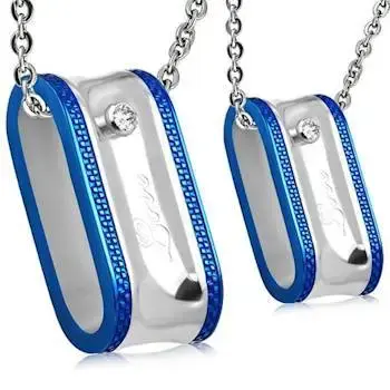 Smykkerne er fremstillet i blank stål, der giver en moderne og tidløs æstetik. Den smukke blå kant tilføjer et strejf af farve, som gør dem ekstraordinære. Det store vedhæng til manden måler 1 x 2,5 cm, hvilket giver en markant og maskulin profil. For hende har vi et delikat vedhæng, der måler 0,8 x 2 cm – perfekt til at komplimentere enhver outfit med en subtil elegance.