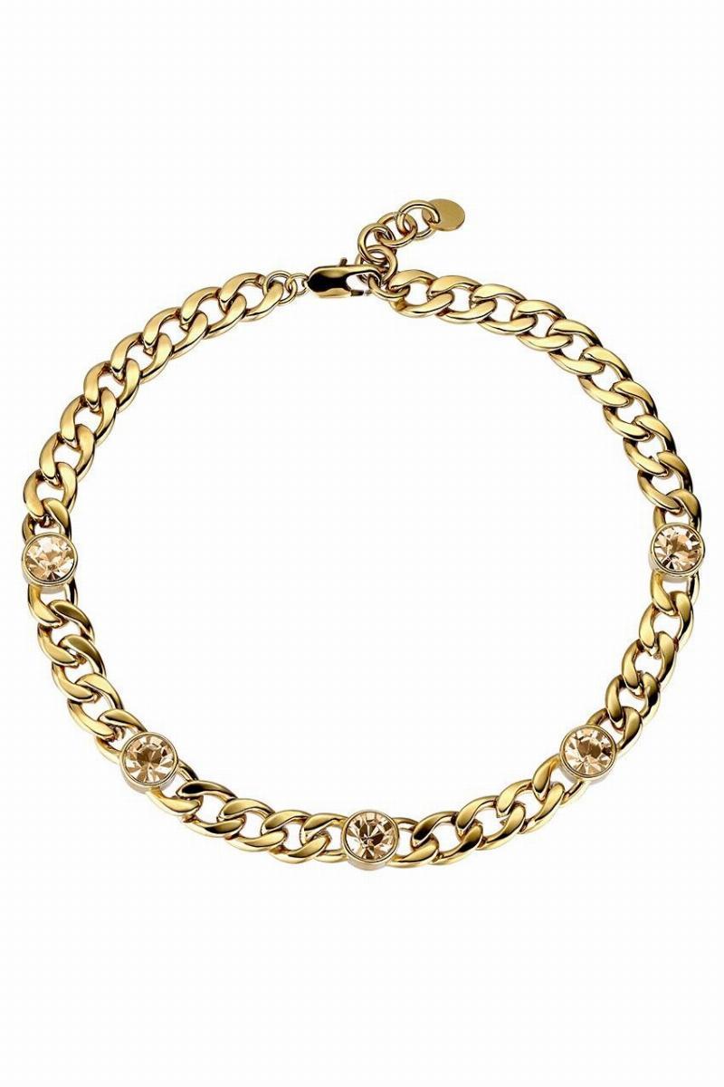 Halskædet er fremstillet i poleret stål, hvilket giver det et moderne og tidløst udtryk. De fem store krystaller er strategisk placeret for at skabe en fantastisk effekt, der vil lyse dit ansigt op og give dig selvtillid.