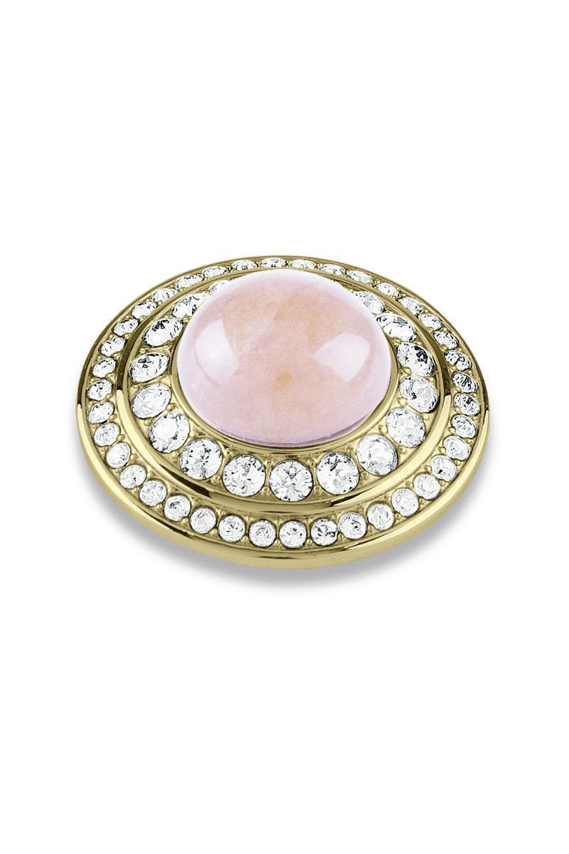 Med sin oversized og dekadente design vil denne topping helt sikkert fange opmærksomheden hos alle omkring dig. Den er prydet med håndsatte klare krystaller, som glitrer vidunderligt i lyset, samt en stor cabochon sleben rosakvarts halvædelsten, der tilfører et blødt og feminint touch. Det er ikke bare et smykke; det er et statement piece, der udstråler selvsikkerhed og elegance.