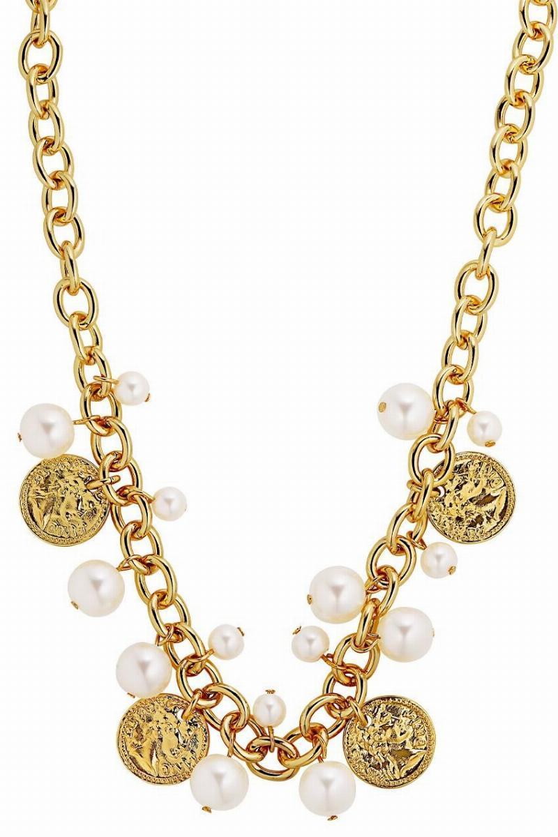 – Materiale: Poleret guldtonet stål med guldmønter og hvide imitationsperler