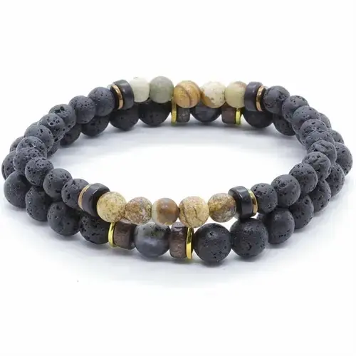 Hver perle er omhyggeligt udvalgt og inkluderer en blanding af lava, træ og edge stone perler. Disse materialer bringer både tekstur og dybde til designet, hvilket gør hvert armbånd unikt. For at tilføje et ekstra touch af luksus er der også indsat nogle forgyldte stålbeads mellem perlerne. Dette giver en elegant kontrast og sikrer, at disse armbånd kan bæres både til hverdag og fest.