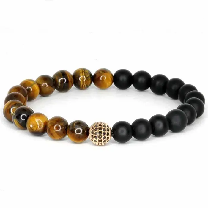 Armbåndet består af 8 mm perler, der er strakt på elastik for optimal komfort og pasform. De smukke brune Tigereye-perler udstråler en varm glød, mens Blackstone-perlerne tilføjer et sofistikeret touch. Den centrale perle prydes med sorte CZ sten, hvilket giver armbåndet et ekstra strejf af luksus.