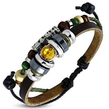 Armbåndet kombinerer et stilfuldt læderdesign med bløde bomuldsdetaljer og en række smukke beads, der skaber en perfekt harmoni mellem elegance og afslappet stil. Den store CZ sten i midten fanger straks opmærksomheden med sin strålende glans og dybe gule farve, hvilket gør dette armbånd til et ideelt valg for dem, der ønsker at tilføje lidt ekstra flair til deres look.