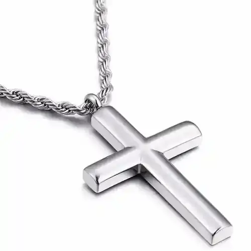 Korset, der pryder dette halssmykke, måler 2,7 x 4,5 cm og er lavet af rustfrit stål af høj kvalitet. Det blanke finish giver en fantastisk glans, der fanger lyset og tiltrækker opmærksomhed. Uanset om du bærer det til hverdag eller ved særlige anledninger, vil dette kors være et iøjnefaldende element i dit outfit.